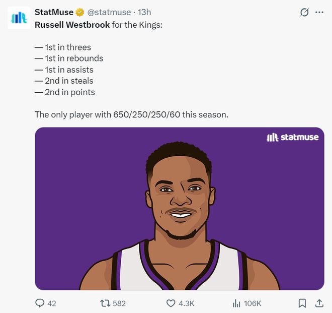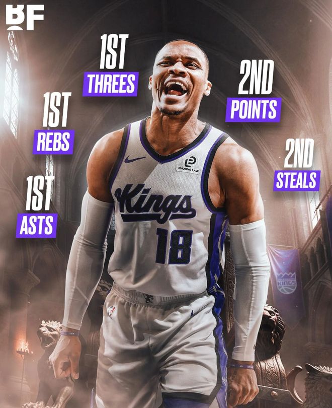 此役转播方还在比赛间隙晒出威少本赛季在国王的数据,得分678分第二、三分89个第一,篮板272个第一,助攻306次第一,抢断61个第二,就连官方都为37岁的威少点赞了。