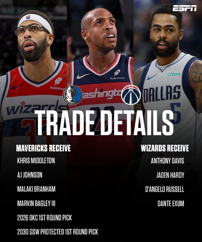 独行侠与奇才的4换9大交易同样震惊联盟。安东尼·戴维斯被送往华盛顿,换回了米德尔顿、AJ·约翰逊以及2个首轮签。具体交易信息如下: