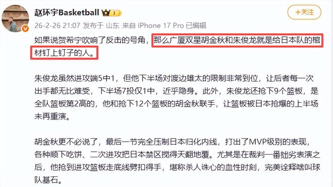 另一位媒体人付政浩也表达相同的观点。他指出,“朱俊龙全场得到6分9篮板看似不显山不露水,但实则是防守端的第一功臣。中国男篮全场拼下34个篮板,广厦出品的这两位球星合计摘下21个篮板,防守端的价值不言而喻。”赵环宇赞扬广厦双星胡金秋和朱俊龙就是给日本队的棺材钉上钉子的人。一点也没有说错。对此,你们怎么评论?
