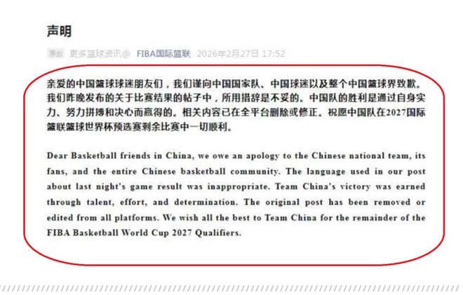 与此同时,国际篮联还表示已经对全平台进行修正和删除不正当的言论。同时,也是希望中国男篮在接下来的2027年世界杯预选赛一切顺利。