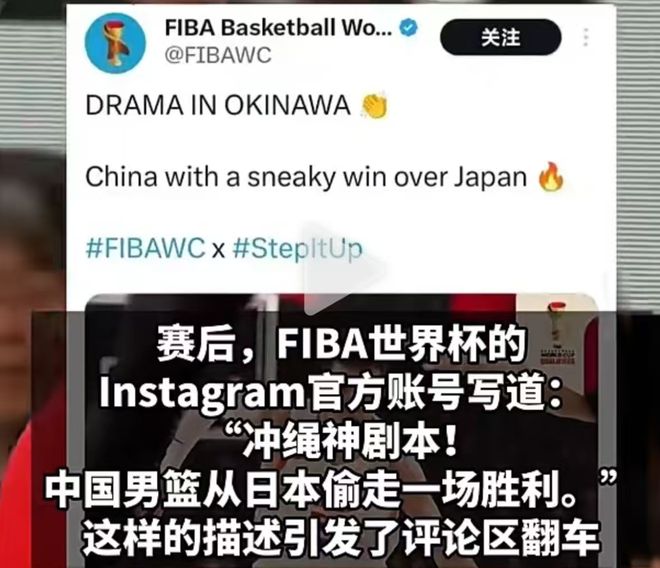 然而,让人感到遗憾的是,中国男篮努力在客场击败日本队,拿到比赛胜利,却遭到了国际篮联的调侃,在赛后,FIBA国际篮联在网络平台上是这样写道:冲绳的神剧本!中国男篮从日本偷走一场比赛胜利。